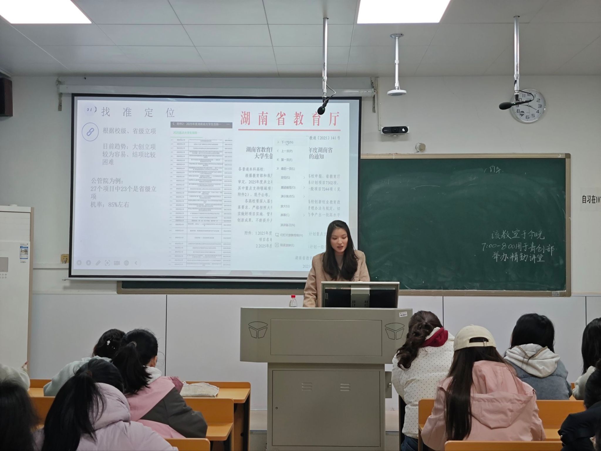聂晨晨从前期准备,计划书,答辩和后期计划三大模块展开深度分享。在赛道与选题板块,聂晨晨拆解热门赛道选择逻辑,结合人工智能、乡村振兴、文化创新等赛事热门领域案例,讲解如何结合专业特色与市场需求选定优质选题;重点剖析创新创业计划书撰写重点,同时分享团队分工的高效技巧,帮助同学们厘清备赛框架、优化团队协作模式;答辩部分,则围绕准备时间分配、评委问题应对策略及心态调整方法展开,通过实战案例复盘,传授赛场答辩的实用技巧。