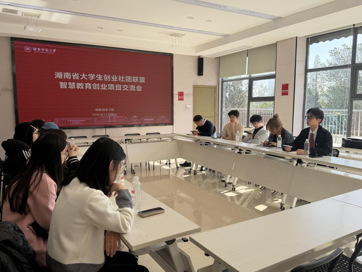 (通讯员 张一凡、彭岁然)2025年11月26日上午,湖南省大学生创业社团联盟智慧教育创业项目交流会在湖南师范大学招生与就业指导处二楼会议室顺利召开。本次会议由湖南省大学生创业联盟理事长洪秦豪主讲,湖南师范大学智慧教育项目团队主要成员共同参与,并特邀生命科学学院胡翔老师出席。