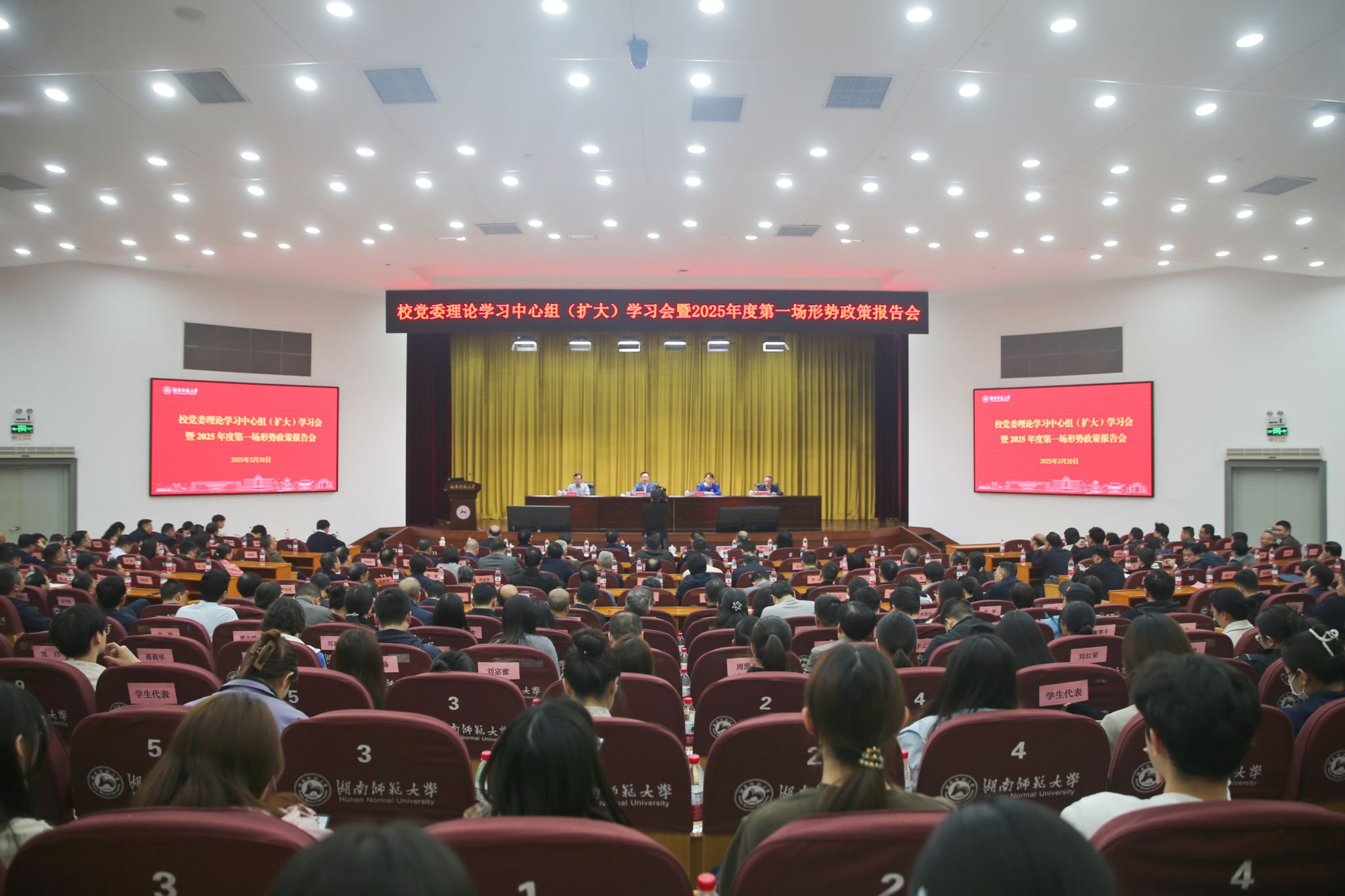 (记者 吴乐 李倩 黄依依)3月20日下午,我校在国际学术报告厅召开校党委理论学习中心组(扩大)学习会暨2025年度第一场形势政策报告会,传达学习贯彻全国两会精神。校长、中国工程院院士刘仲华主持会议。全国两会期间,全国人大代表、法学院肖北庚教授和全国政协委员、副校长谢资清教授切实履职尽责,提交多份高质量的建议提案,发出了师大人的声音、展现了师大人的担当、显示了师大人参政议政的能力和水平。肖北庚教授以《扎...